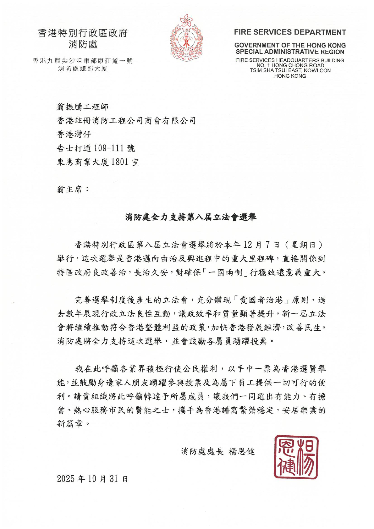 2025立法會換屆選舉 12月7日齊投票第八屆立法會選舉將於 2025年12月7日(星期日)舉行。近日,本會收到多個政府部門呼籲市民積極參與投票。 昨日本會接獲消防處處長親函,鼓勵各會員公司員工,以及其家人、朋友及業界同仁,踴躍行使公民權利,積極投票,選出能真正代表市民聲音的立法會議員,攜手推動香港良政善治、繁榮進步,共創更美好的明天。 附上消防處處長的來信及政府宣傳海報,以供參閱。 期昐各會員踴躍支持參與。 主席 翁振騰 消防商會 Related Posts 2025-11-04消防處積極與不同界別交流呼籲踴躍投票 2025-10-10賽馬全接觸 2025「順迪有限公司」贊助 2025-10-08消防商會支持 – 物聯網火警偵測系統先導計劃